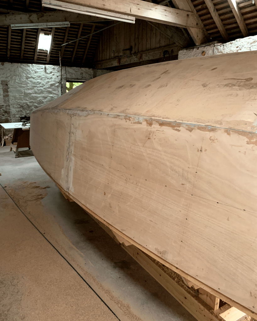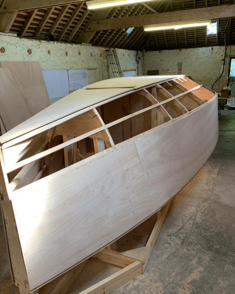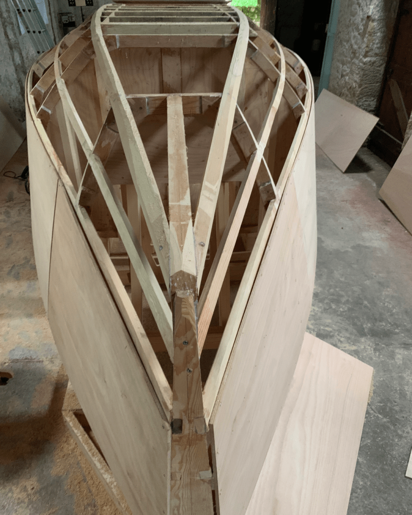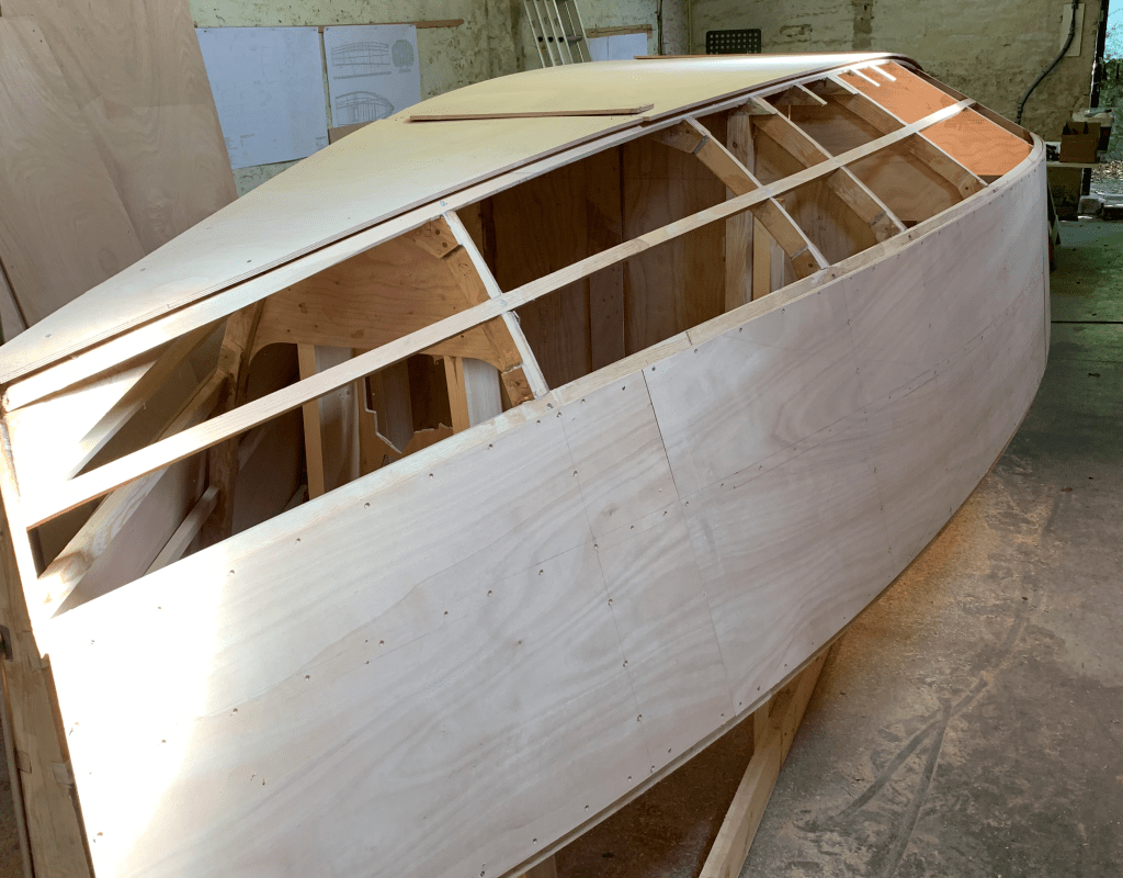 I don’t think my technique was the best but it eventually worked. I used clamps and straps to help and didn’t find any benefit from gradually bending the ply into shape. The process took much longer than I’d thought. Working alone again means things take more than twice as long. I spent two to three weeks on this phase.