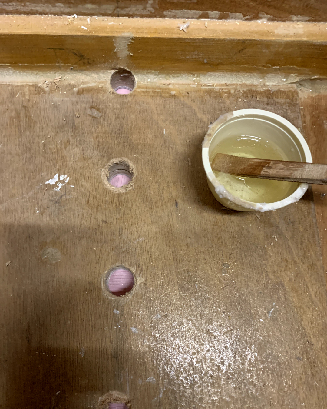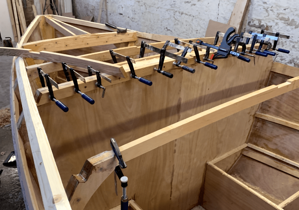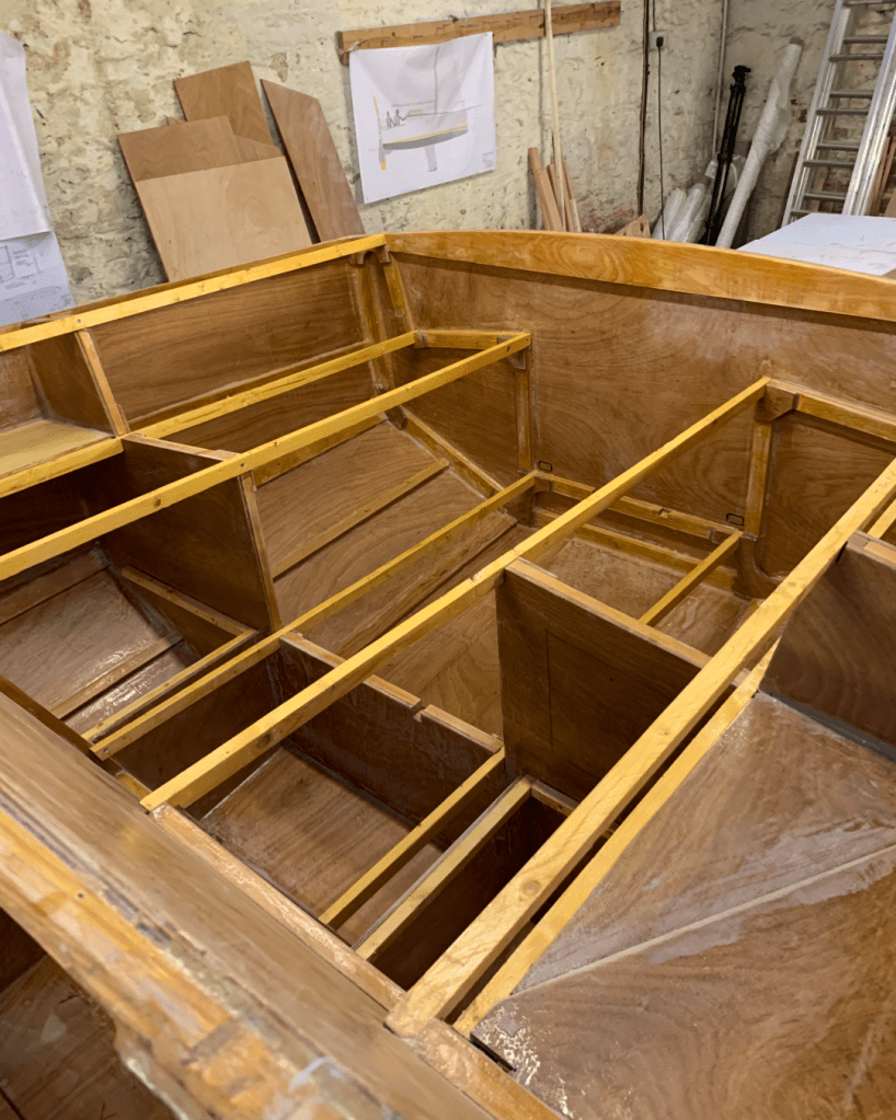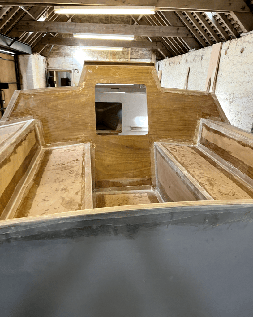 The cockpit is completely sealed from the internal cabins. It will have three large drain holes to let water drain. As with the rest of the outside of the boat it is covered in fibreglass to strengthen the whole structure and make fully waterproof.