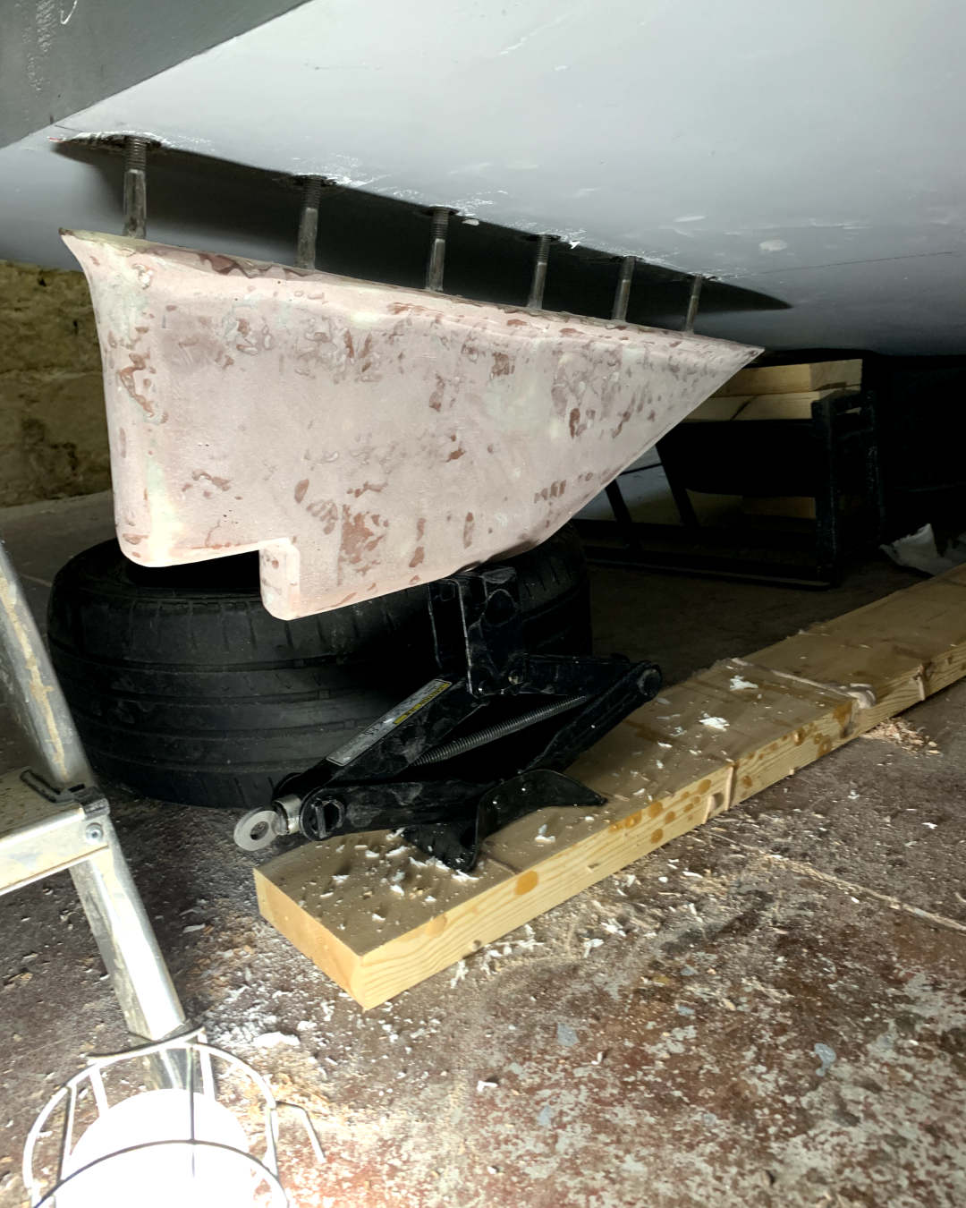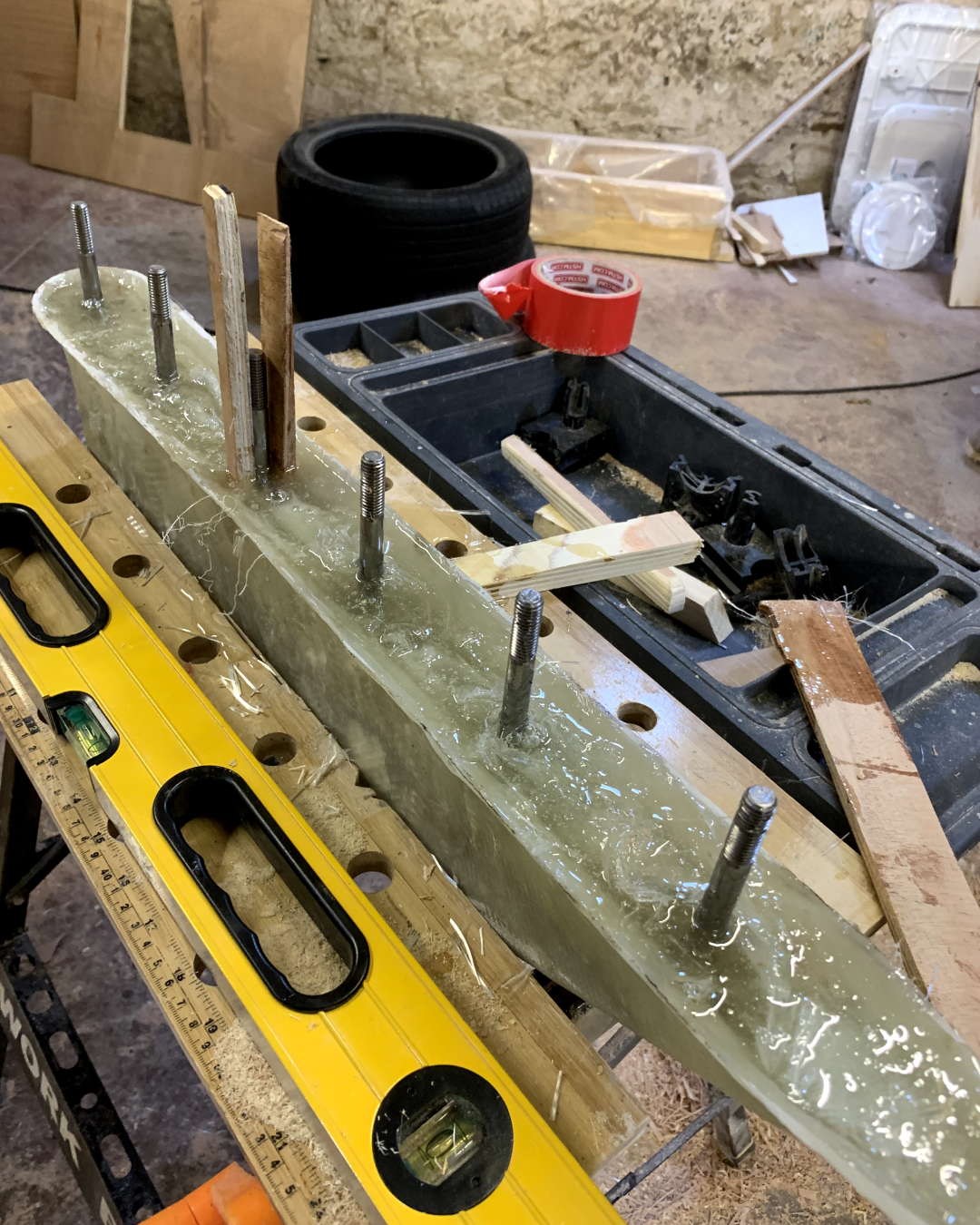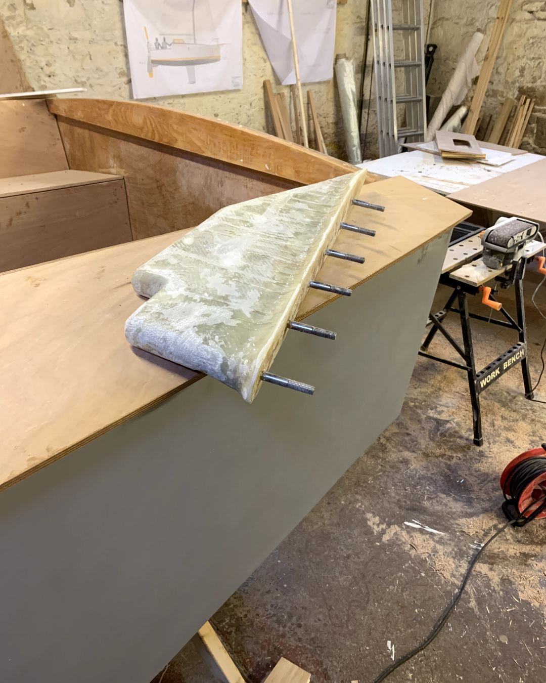 It is vital to have a strong skeg as the rudder fixes onto the boat at the top of the transom and the skeg at the bottom.A previous builder, Pete Kenyon, who sailed his Mini 580 across the Atlantic used3d printing to make a template of the skeg. I used this to make the skeg. Many thanks Pete! Stepone, cover the template with fibreglass. Step two, take out the template and fill the void with epoxy resin and chopped up fibreglass. Many thanks to my friend Hector for making the stainless bolts to bolt the skeg onto the bottom of the boat