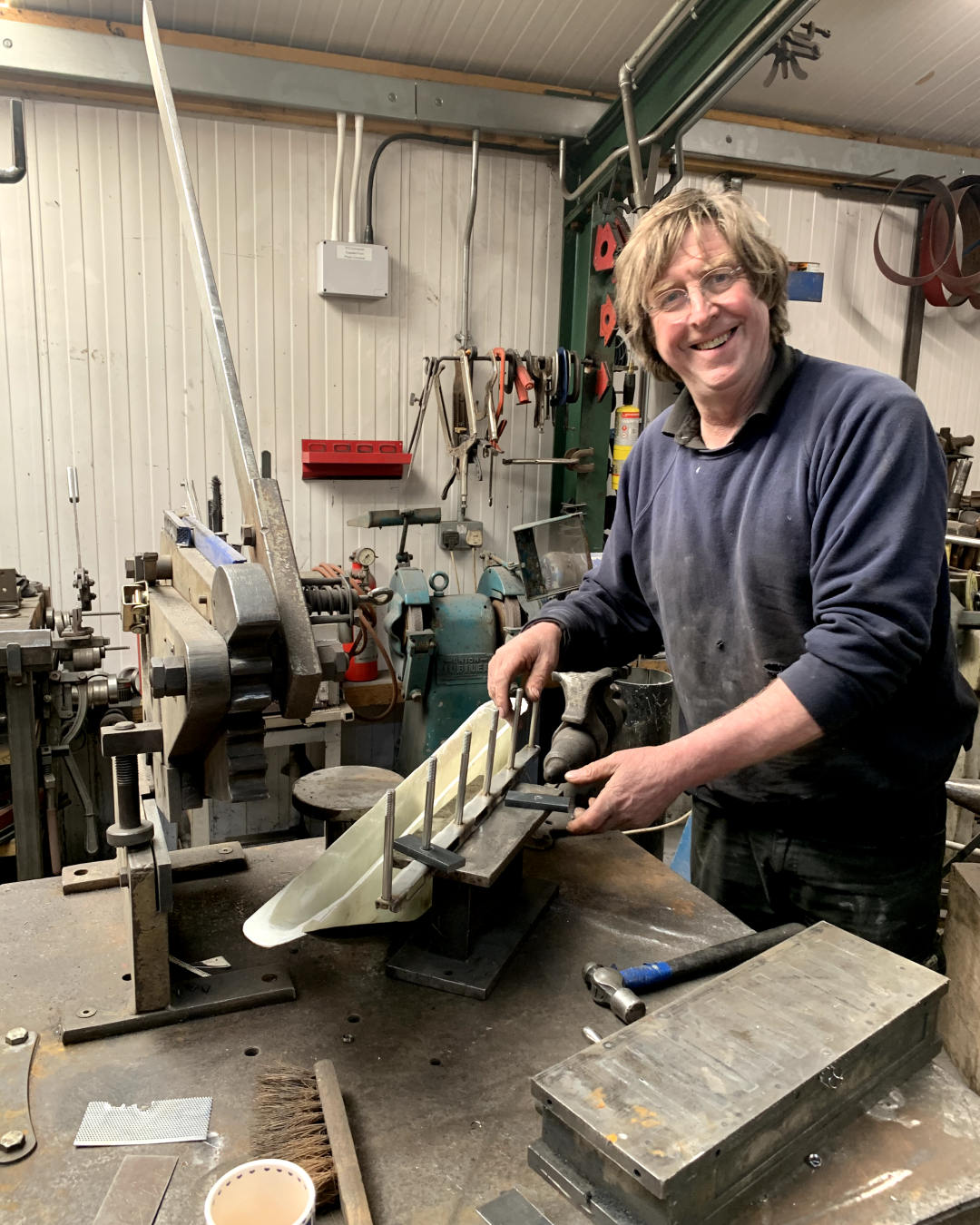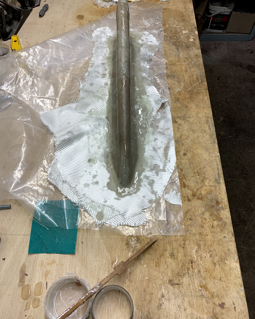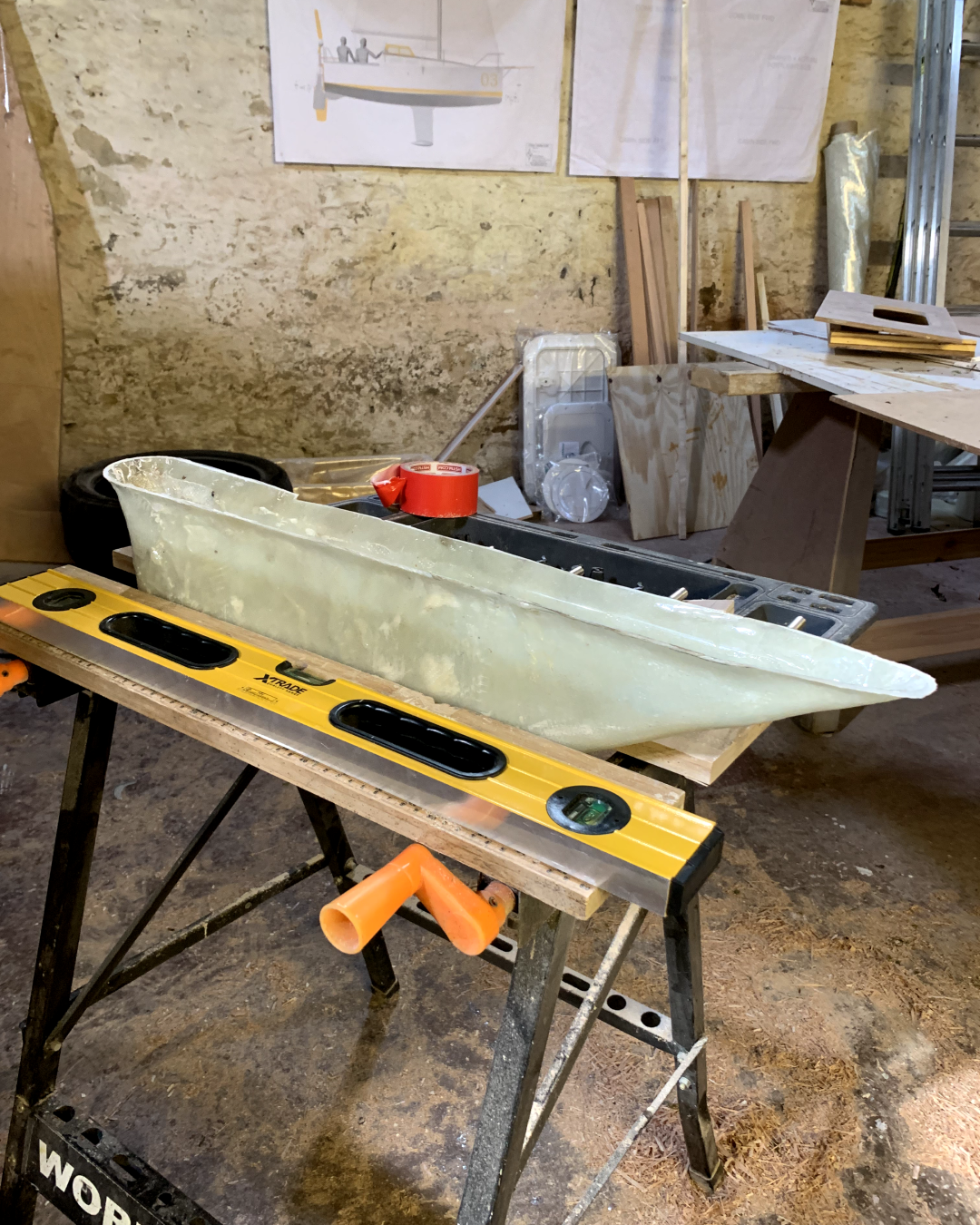 It is vital to have a strong skeg as the rudder fixes onto the boat at the top of the transom and the skeg at the bottom.A previous builder, Pete Kenyon, who sailed his Mini 580 across the Atlantic used3d printing to make a template of the skeg. I used this to make the skeg. Many thanks Pete! Stepone, cover the template with fibreglass. Step two, take out the template and fill the void with epoxy resin and chopped up fibreglass. Many thanks to my friend Hector for making the stainless bolts to bolt the skeg onto the bottom of the boat